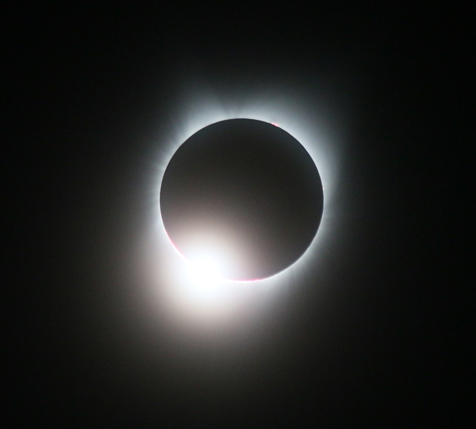 At the 5 minute until totality mark, we took off the solar shields and readied our equipment. I was on the scope anticipating the phenomenon. Soon enough, "BOOM!" We were in the umbra. With the naked eye, I could see the corona in a platinum-like light which I considered to even have blue hues. The surrounding area was in a twilight haze and 360 degree sunset. We were all speechless. I mounted up the scope to my eye and could see the corona, electromagnetic looking shimmering waves, and a bright pink, coronal mass ejection from the 1 o'clock position on the sun. I could not believe it! We had a one minute timer set for optic rotations and everyone saw the event through all optics. I even tried a selfie which was a little strange with the light. Even though the corona was easily viewable with the naked eye, the camera still got whited out from it. The photo of me and Katherine doesn't show the corona very well, but it does represent the low light in the area. Alan got some nice shots below.
